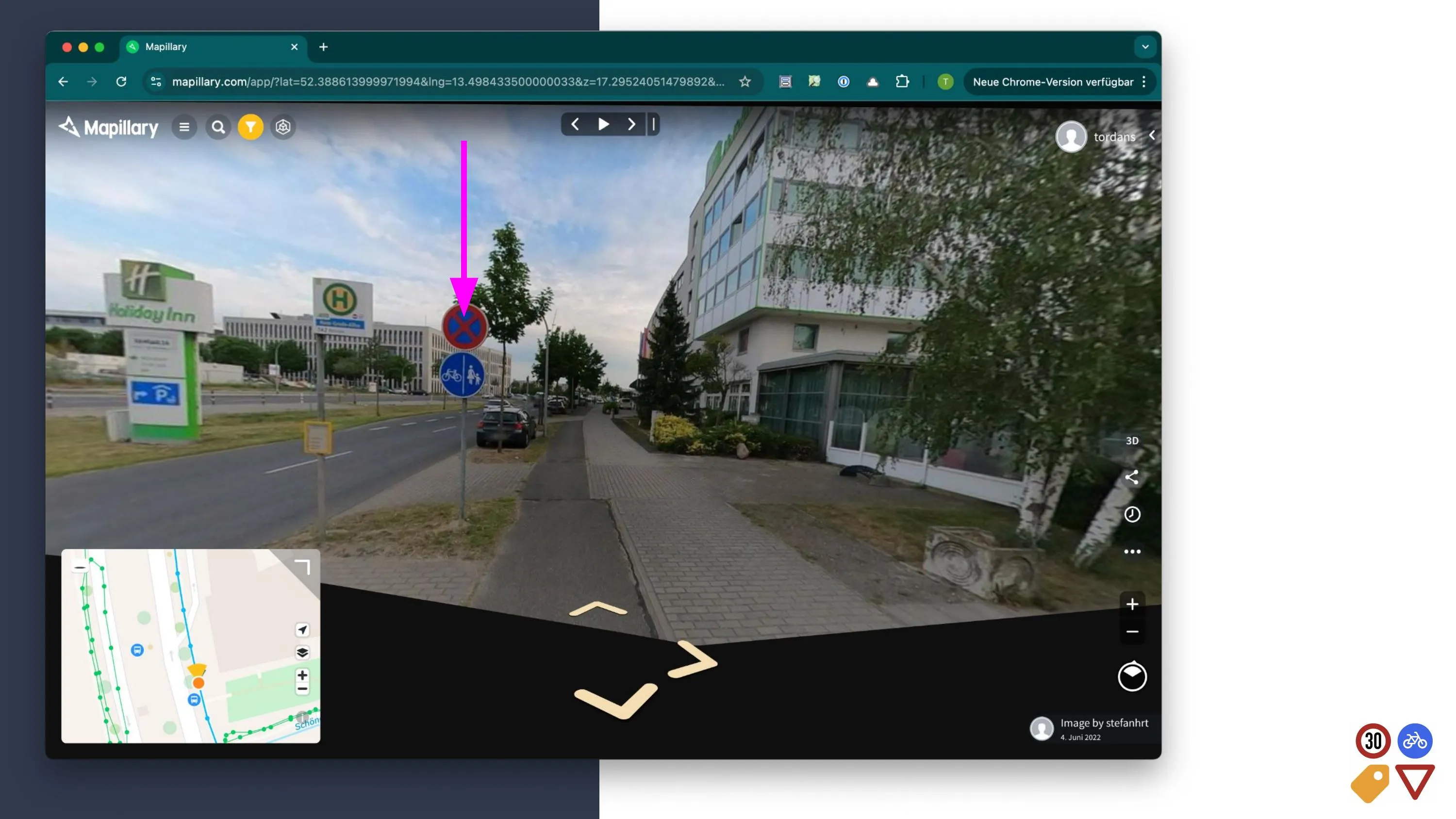 Mit Mapillary können wir das Verkehrszeichen überprüfen und die Daten in OSM korrigieren: