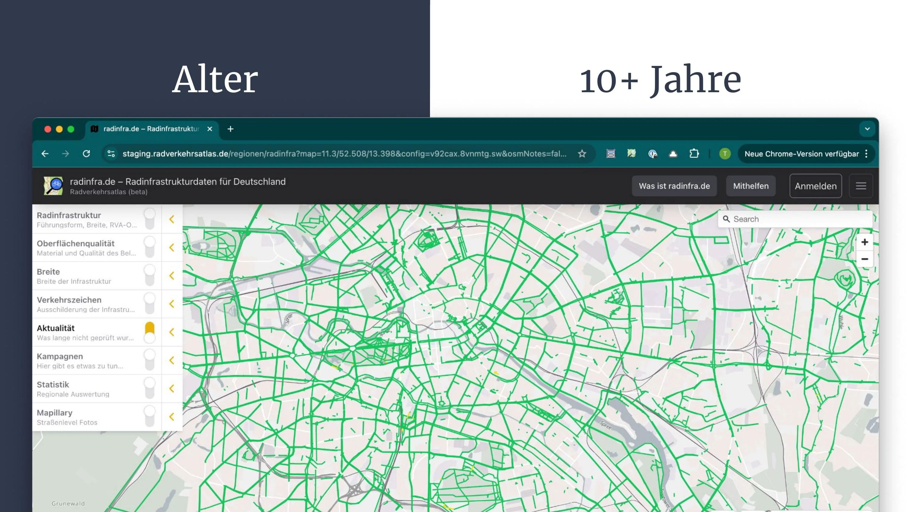 Diese Qualität macht OSM für Verwaltungen und die Zivilgesellschaft attraktiv – beispielsweise bei der Planung von Radinfrastruktur. Häufig ist OSM bereits die bessere Datengrundlage, da bestehende Daten entweder ganz fehlen oder nach sehr unterschiedlichen Kriterien erhoben wurden.